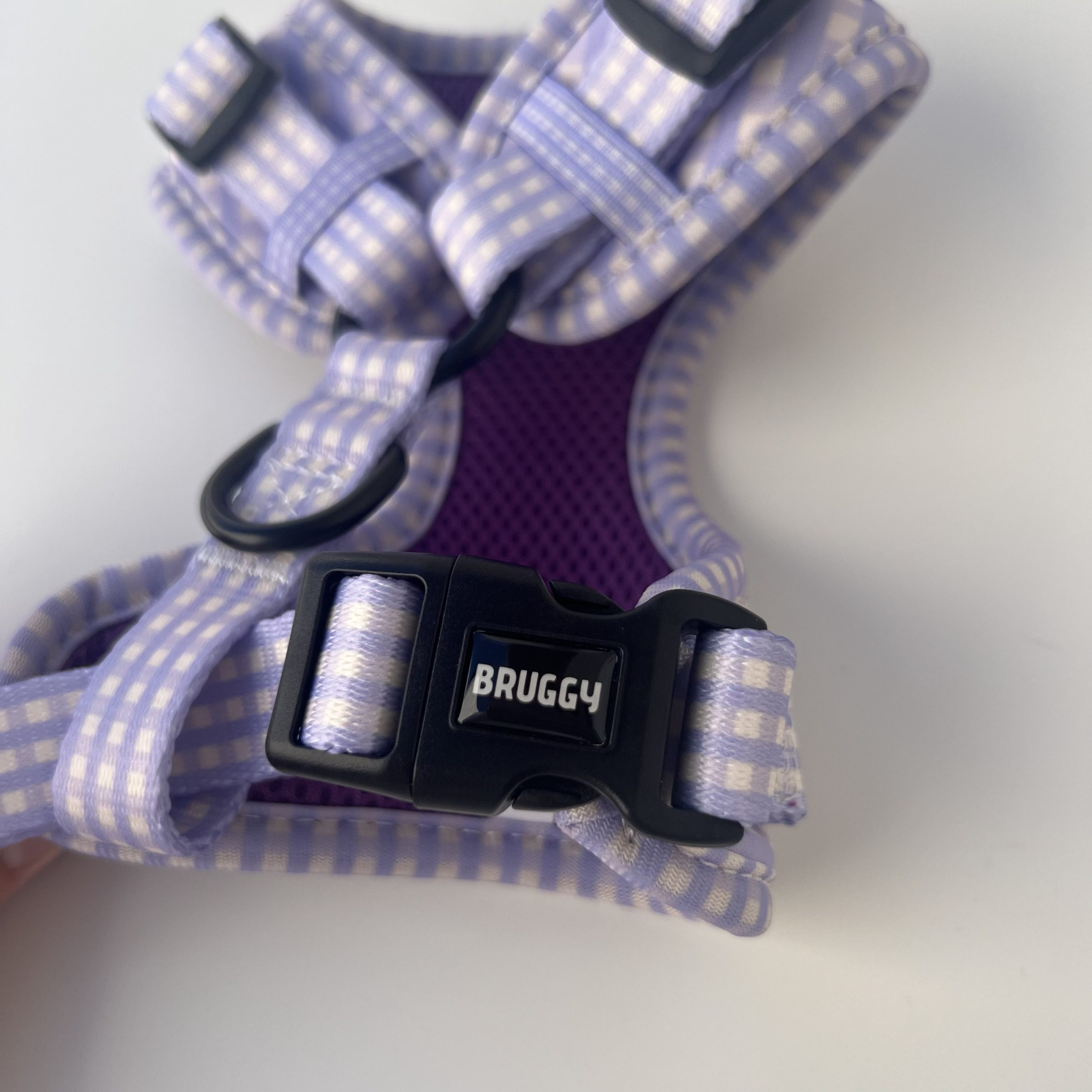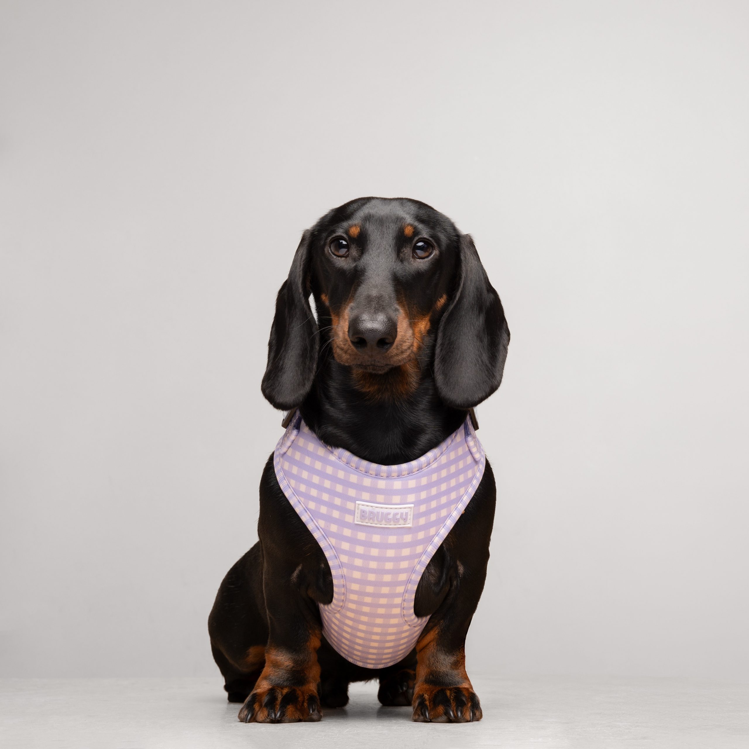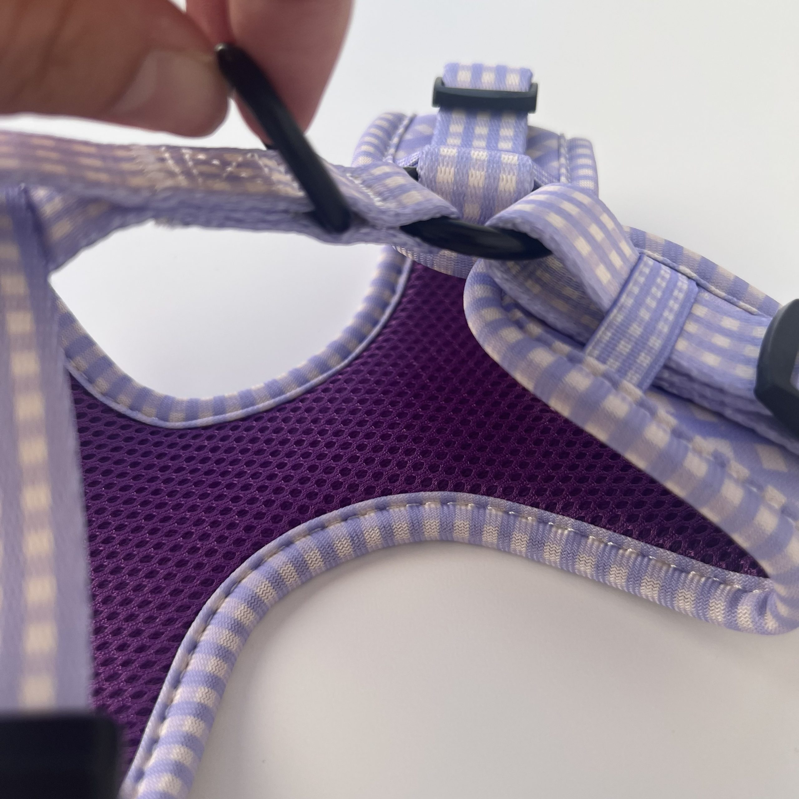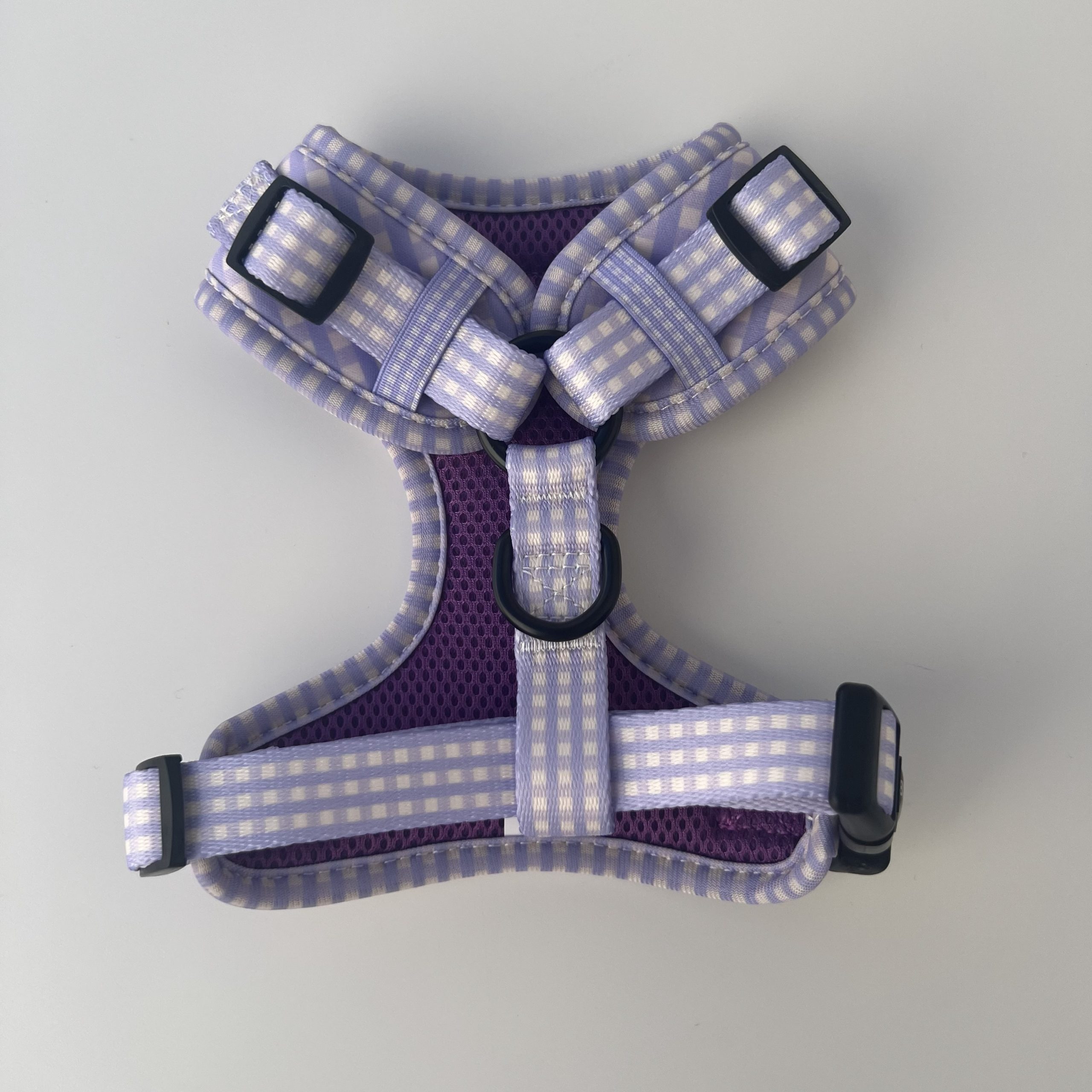 El ARNÉS VICHY LAVANDA combina estilo y comodidad. Ajustable en cuello y torso, hecho de materiales resistentes y transpirables, ideal para mantener a tu perro cómodo y seguro en todo momento.
