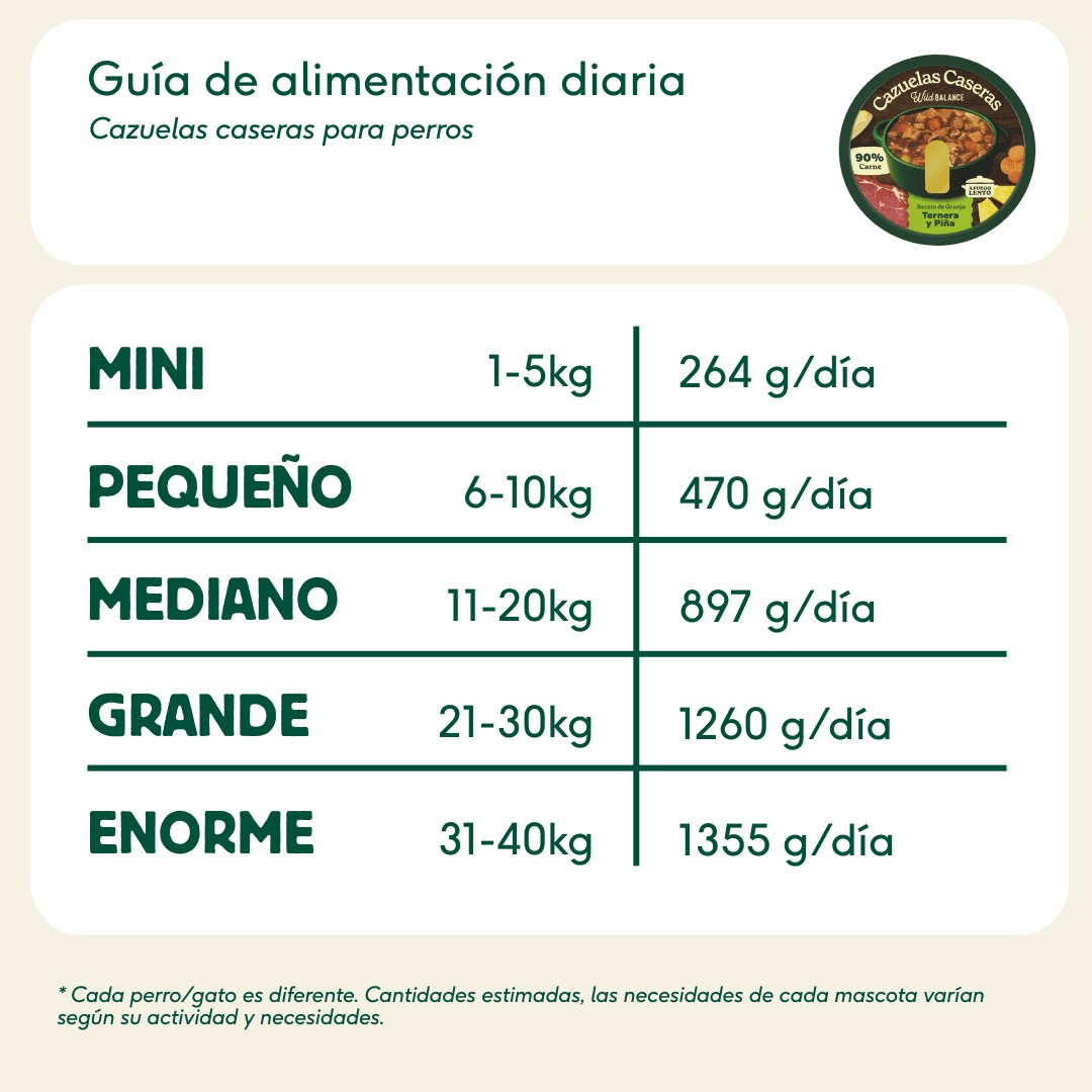Estas cantidades son aproximadas y pueden ajustarse según ejercicio, actividad y metabolismo de cada perro.