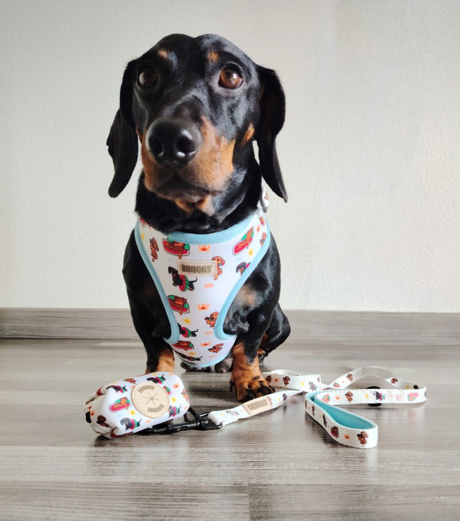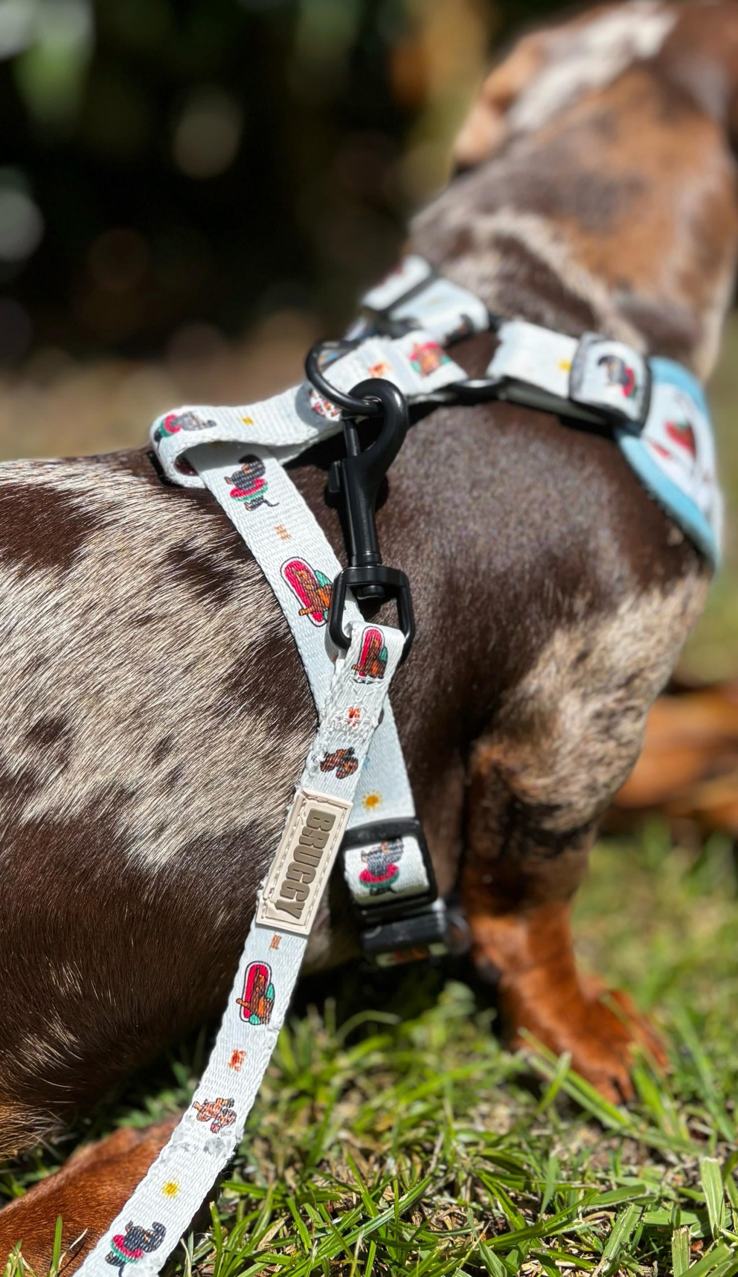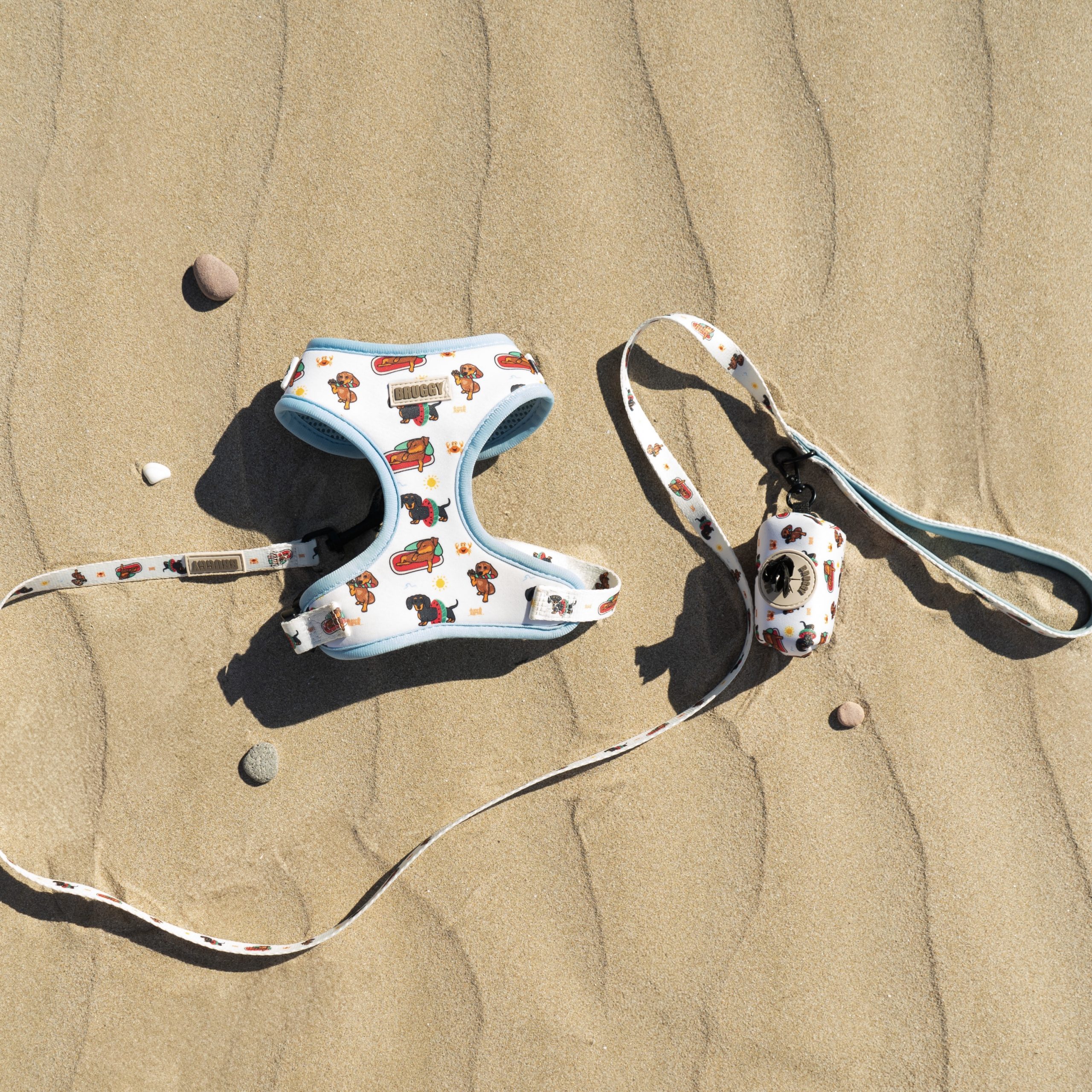 Con el PACK SALCHI SUMMER tu pelud@ va siempre conjuntado y con estilo. Arnés, correa y porta bolsas a juego, cómodo, seguro y con un estampado veraniego, ideal para tu teckel.