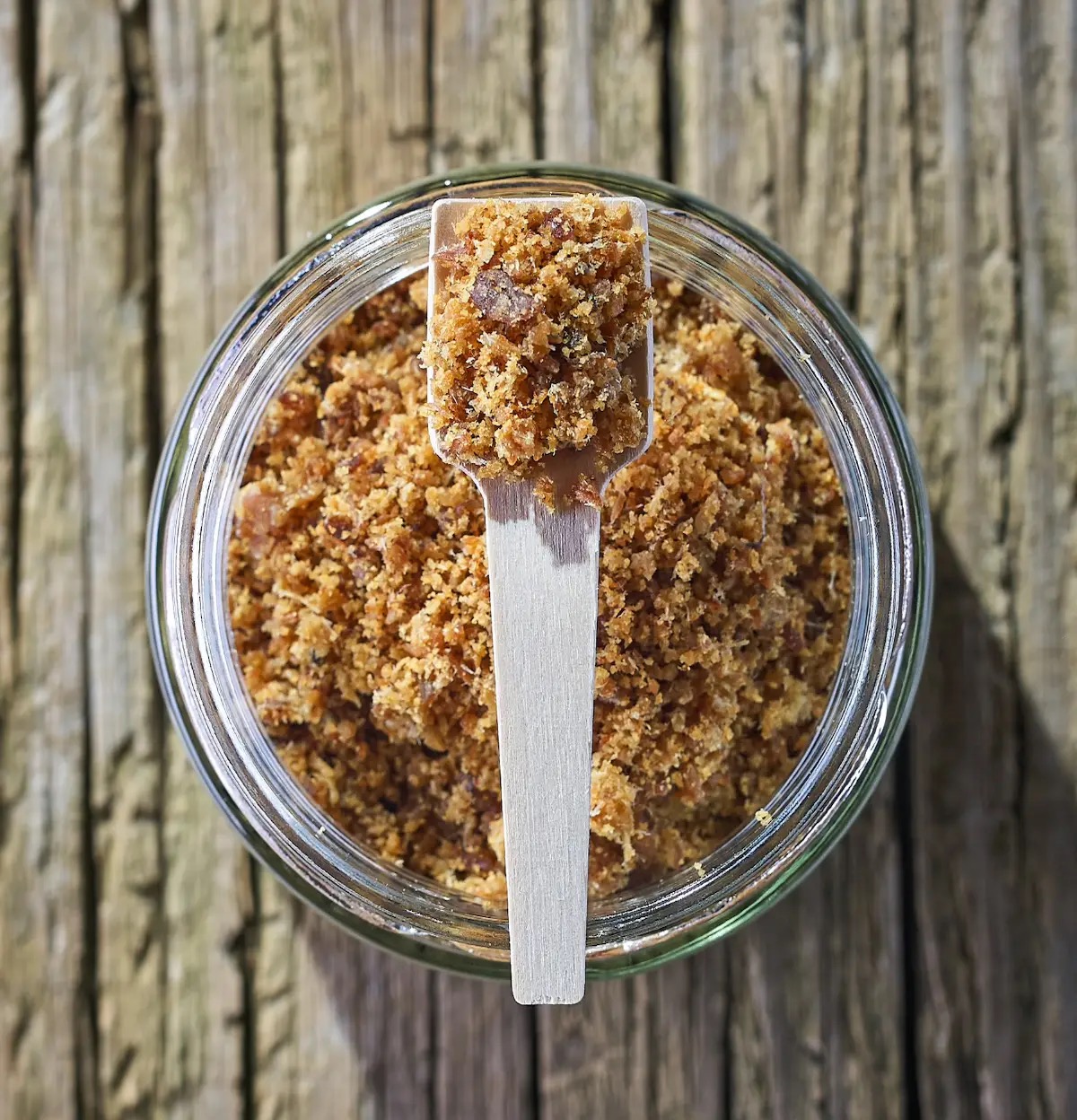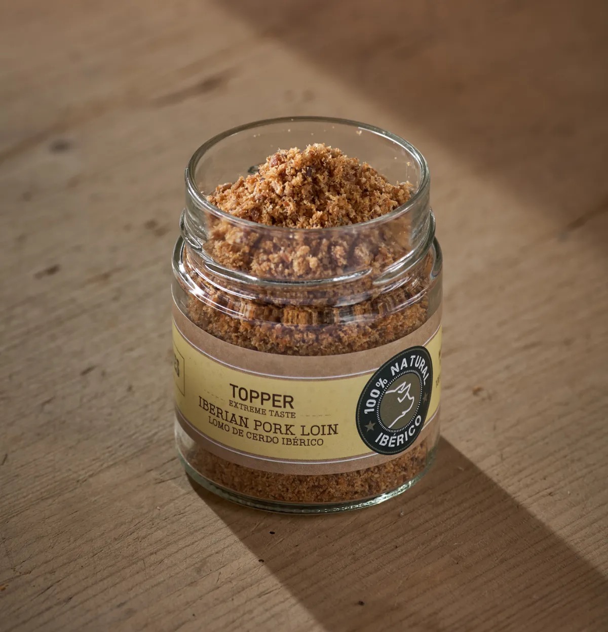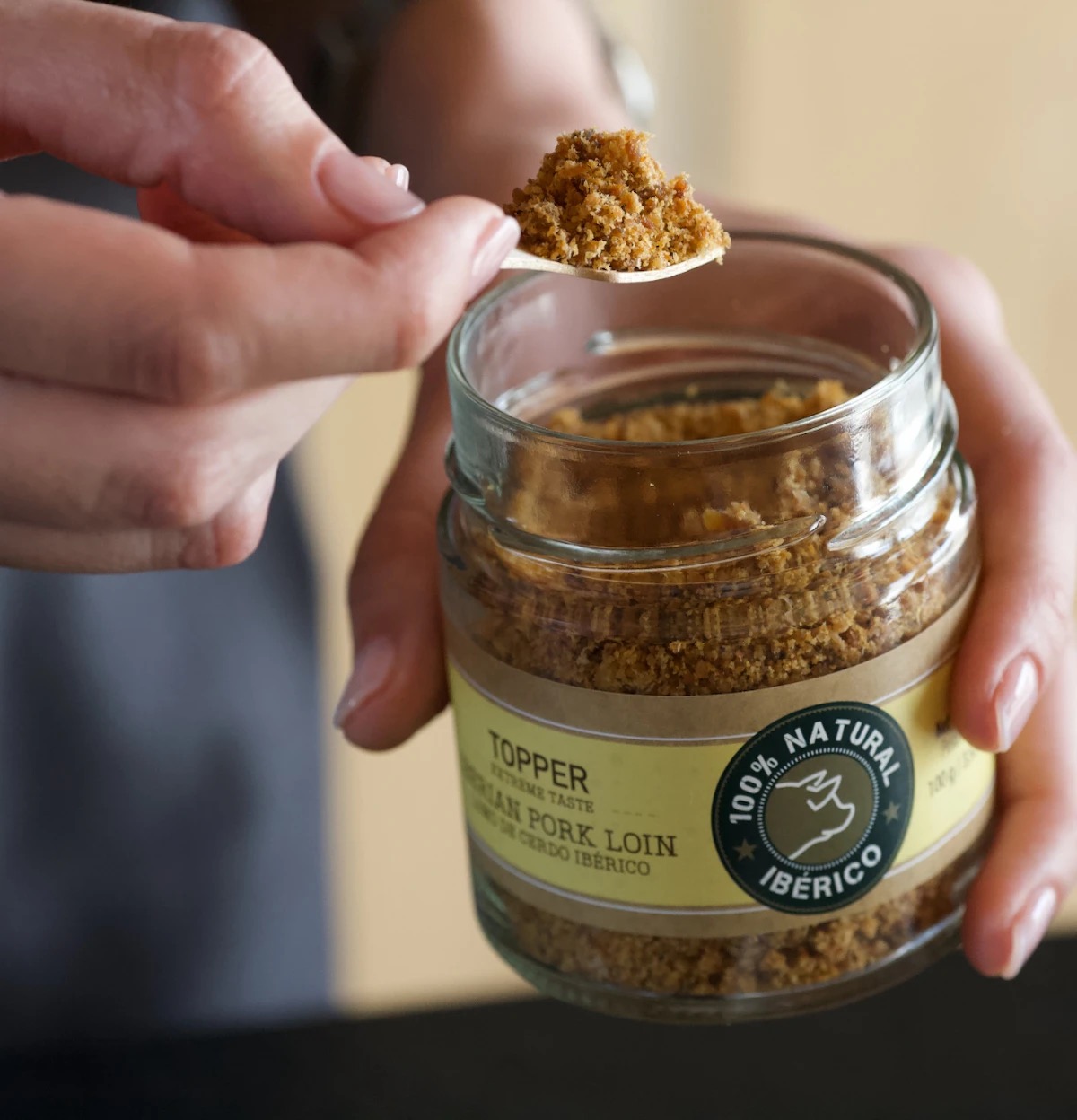 Proviene de cerdos ibéricos criados en la dehesa de Extremadura, alimentados en libertad con una dieta natural. Su carne, rica en proteínas y grasas beneficiosas, se deshidrata a baja temperatura y se tritura hasta conseguir una textura granulada, manteniendo su delicioso aroma y potenciando su sabor único.